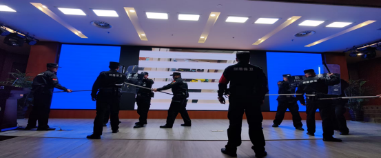 最后压轴出场的是保安团队。他们首先进行了日常列队训练展示,步伐铿锵,动作整齐划一;随后,他们现场演示了盾牌、钢叉等安防器械的标准使用方法。他们用刚劲有力的表演,彰显了守护医院平安的坚定决心与专业能力,赢得了全场阵阵掌声。